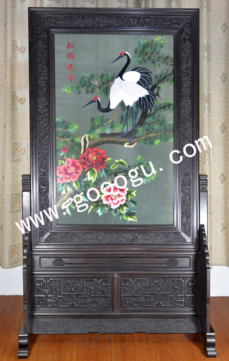 蘇繡玄關(guān)屏風(fēng) 松鶴延年 手工刺繡 雞翅木 祝壽禮品 送長者